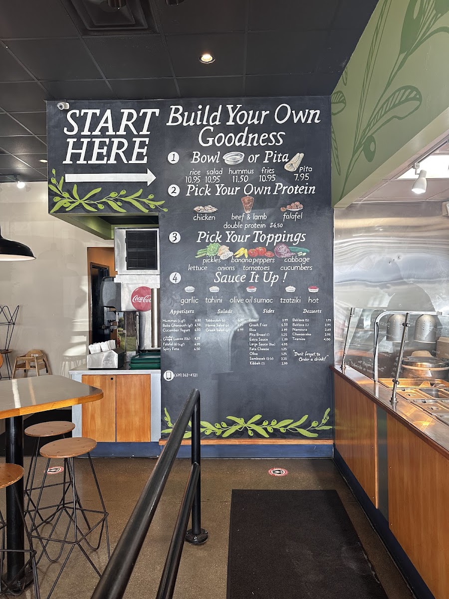 “ came here for a quick and delicious dinner. The food smelled so good and the people working at the restaurant were so kind and welcoming to us, we decided to sit down and pig out. Plus the music was fun. The stuffed grape leaves & hummus were yummy appetizers and they conveniently give them to you in a container you can take home for extra. We had beef/lamb in our plates and they were delicious and juicy! The spicy feta and tabouli were great too. We tried both the mixed berry drink (with pomegranate juice) and the orange cardamom. Would recommend trying the drinks! At one point we watched one of the servers carefully go through all the ingredients in each sauce/dish for a customer with celiac disease and then he made sure to wash his hands before getting the food. He really took the time to make sure that the customer had a good and safe meal and we felt comforted seeing how much they genuinely care here. When we left the servers asked us how it was and made sure we enjoyed everything. Overall we had a great meal and the service was excellent. ”